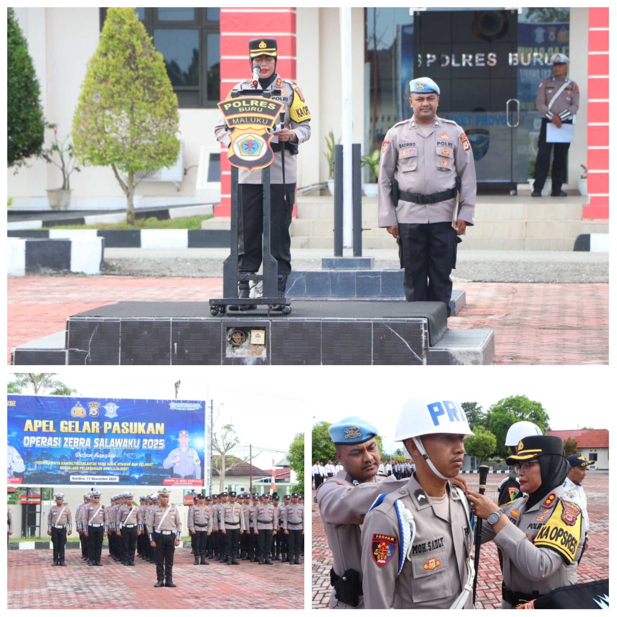 sinarmaluku. com – Polres Buru menggelar Apel Pasukan Operasi Zebra Salawaku 2025 di Lapangan Apel Polres Buru, Senin (17/11/2025).