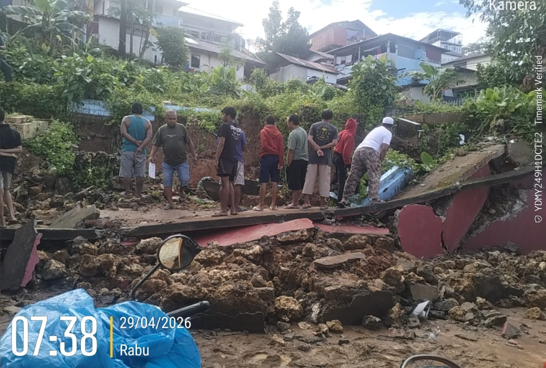 Peristiwa tersebut terjadi di halaman Masjid Al-Muhajirin RT 002 RW 004 Negeri Batu Merah, akibat tingginya curah hujan pada Selasa (28/4/2026), yang menyebabkan dinding penahan kuburan dan area sekitar masjid runtuh, serta menyeret beberapa makam di lokasi tersebut.