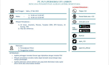 sinarmaluku. com – Hari ini, Minggu (27/5) PT.PLN (Persero) Unit Pelaksana Pelayanan Pelanggan (UP3) akan memadamkan aliran listrik di 8 wilayah di...