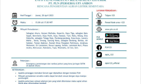sinarmaluku.com – Dipastikan, Besok, Jumat (28/4) PT.PLN (Persero) Unit Pelaksana Pelayanan Pelanggan (UP3) akan memadamkan aliran listrik di 38 wilayah di Kota...